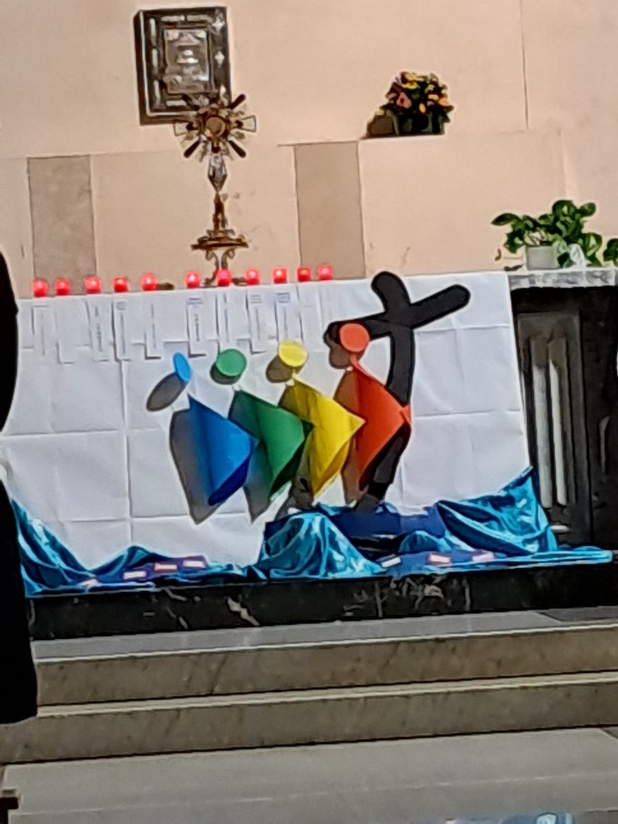 Poi, dopo una presentazione, è stato composto un cartellone raffigurante il logo del Giubileo. Le onde del mare rappresentano quelle piccole e grandi guerre delle nostre vite, le inimicizie, le gelosie, la sete di dominio, le ansie per il futuro e così via, ma è nelle onde di questo mare che affonda l’ancora, la parte inferiore della Croce, a simboleggiare che la Croce è la nostra Speranza, l’appiglio che ci stabilizza durante le tempeste della vita. Le quattro figure stilizzate che si abbracciano e abbracciano la Croce, invece, rappresentano l’umanità proveniente dai quattro angoli della terra, uniti nella fratellanza che accomuna i popoli e ciascuno di noi. Il cammino, infatti, non è individuale, ma sostenuto e generato dalla fraternità in Cristo nella fede e nella speranza, sempre uniti alla Croce di Colui che è Via, Verità e Vita.