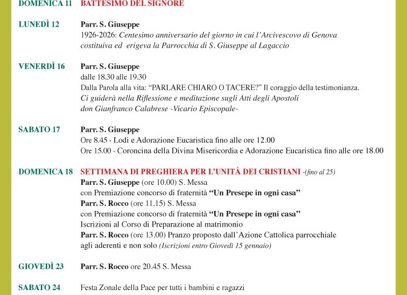 Inviamo l’articolo sul Foglio parrocchiale VOCI DI FRATERNITÀ con i relativi appuntamenti di GENNAIO. Il Foglio cartaceo è ritirabile in fondo alla Chiesa: